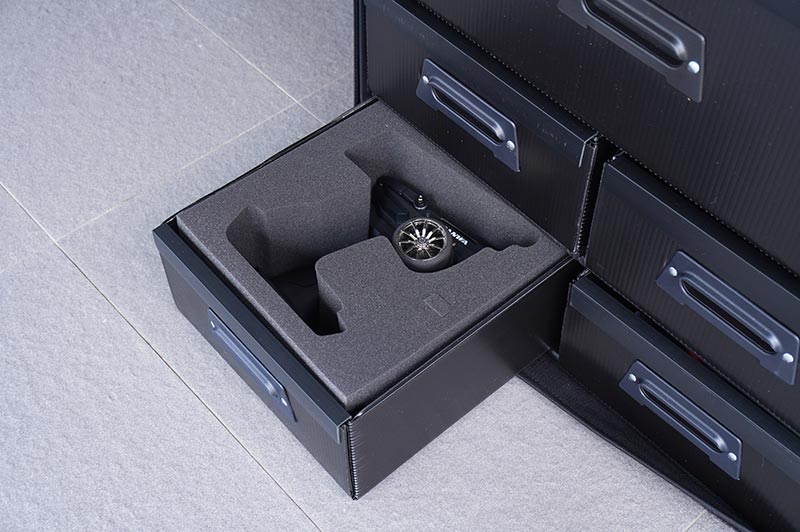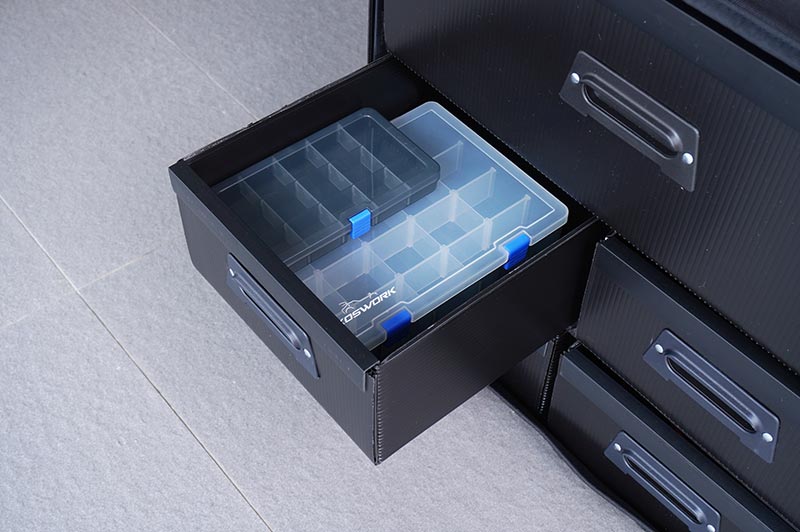 It features one large drawer for the car and four medium drawers for parts, tires, electronics and accessories. Two side zip pockets, a document pocket and a large rear setup-board pocket keep track essentials organized. The top tool organizer offers multiple slots for neat tool storage.