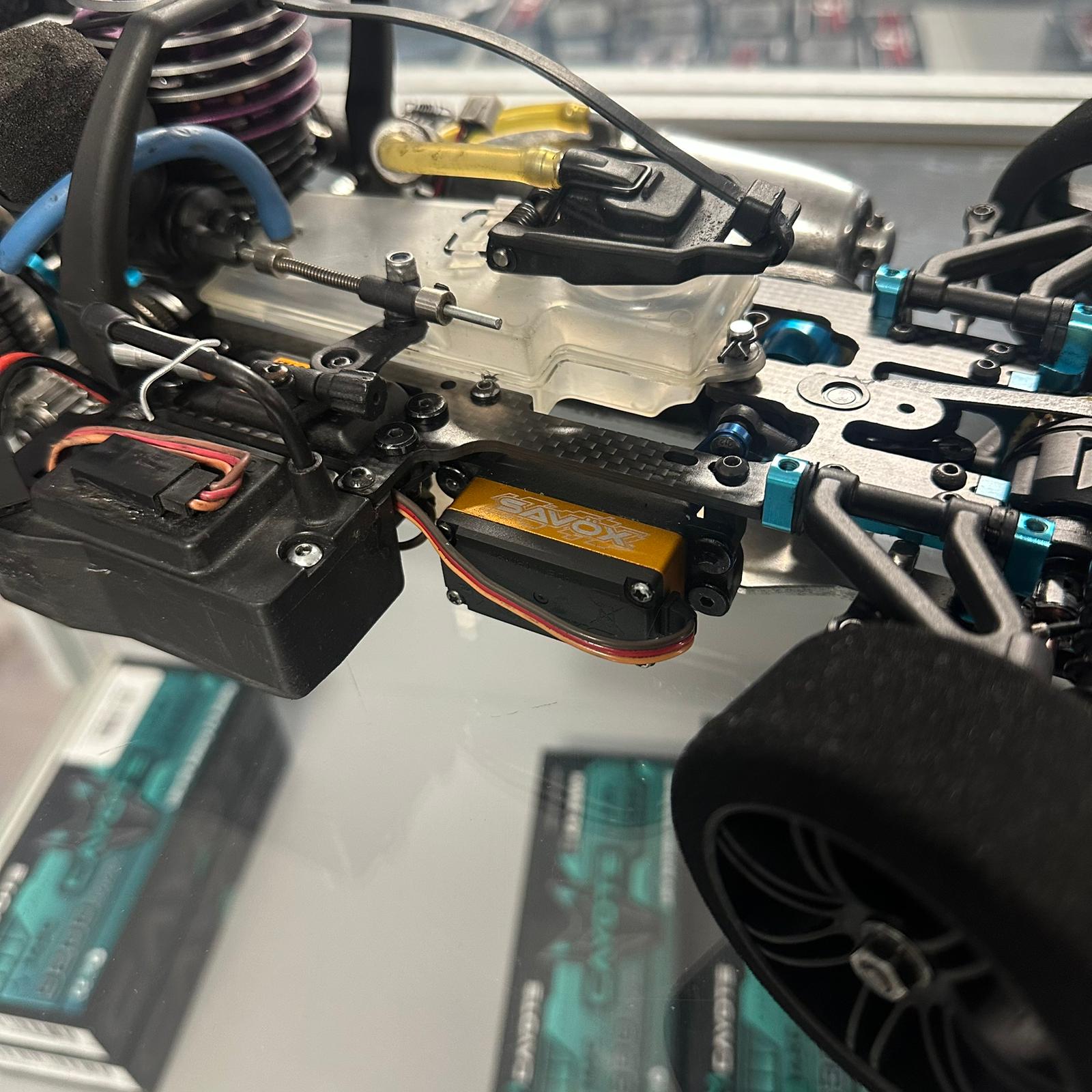 The vehicle is equipped with a powerful Mephisto .21 nitro engine , which ensures strong acceleration and reliable performance in racing and training. Two Savox servos are installed for steering and throttle/brake, which are valued for their high torque and precise feedback.